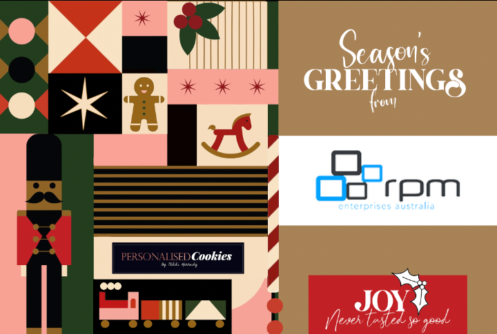 Sugar cookies are topped with vanilla flavoured fondant icing and presented in our Standard Kraft packaging (250x170x52) wrapped in your custom branded sleeve. Packaging is festive print with 'Seasons Greetings' wrapped around your logo.